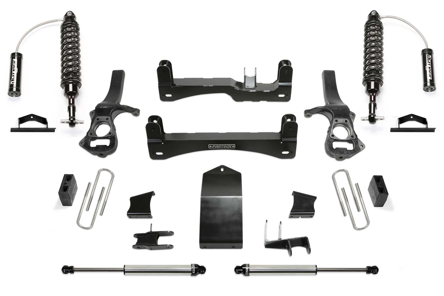 The stainless-steel Dirt Logic 2.5 Coil overs replace the Trail Boss / AT4 coil over with an outstanding ride quality both on and offroad. They are designed for aggressive offroad use yet have a supple on road feel. Rear Dirt Logic 2.25 shocks aid in damping the vehicle for a balanced ride. Fabtech has addressed all aspects of the suspension for proper wheel travel and lock to lock steering without over cycling. All FABTECH systems come with a free 5-year 60,000-mile Powertrain Warranty.